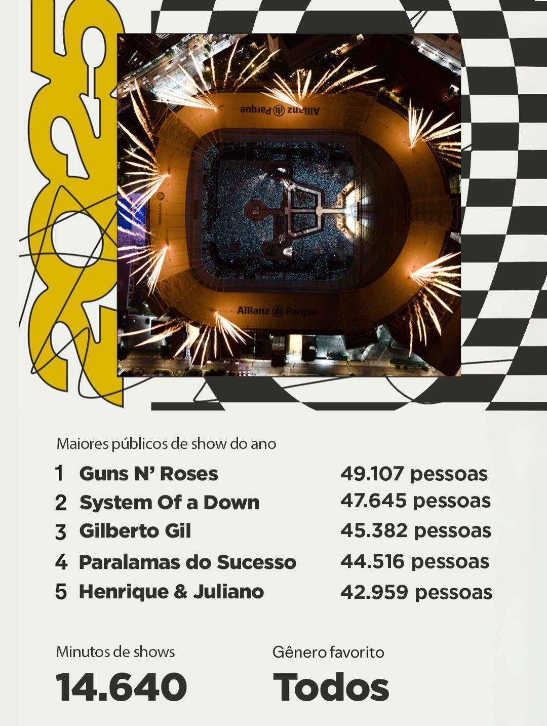 O Allianz Parque divulgou nesta semana o levantamento oficial com os maiores públicos de shows realizados no estádio em 2025. O Guns N Roses aparece na primeira posição, registrando 49.107 espectadores, marca que reforça a relevância contínua da banda e do gênero dentro do cenário musical brasileiro.
